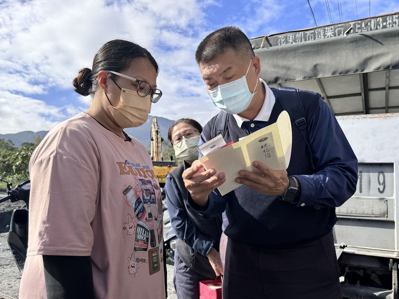 慈濟關懷受到馬太鞍溪堰塞湖溢淹的萬榮鄉明利村、鳳林鎮長橋里災戶,11月20、22日慈濟慈善事業基金會社工與慈濟志工分別前往鳳林鎮長橋里、萬榮鄉明利村進行共50多戶的安心家訪,致上祝福禮、慰問金,挨家挨戶了解災區的受災情形與需求。萬榮鄉明利村受災鄉親朝先生說:「非常謝謝你們,我們會永遠保持健康的心態。」沈先生的住家跟工作室都受災,他表示這筆慰問金要用來恢復家園跟買小孩子的用品,感謝慈濟的愛。