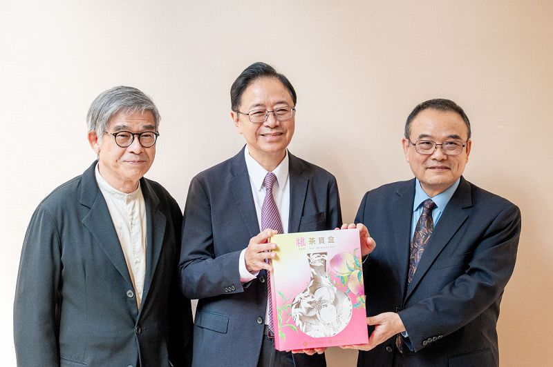 張善政表示,市府與國立故宮博物院聯名推出的「桃茶寶盒」,結合地方冠軍好茶與國寶級文物意象,以清代粉彩蟠桃天球瓶元素,巧妙融合茶文化與藝術,展現桃園精緻農產與城市品味,是兼具精美外型、醇厚茶韻與創意實用的茶文化精品。