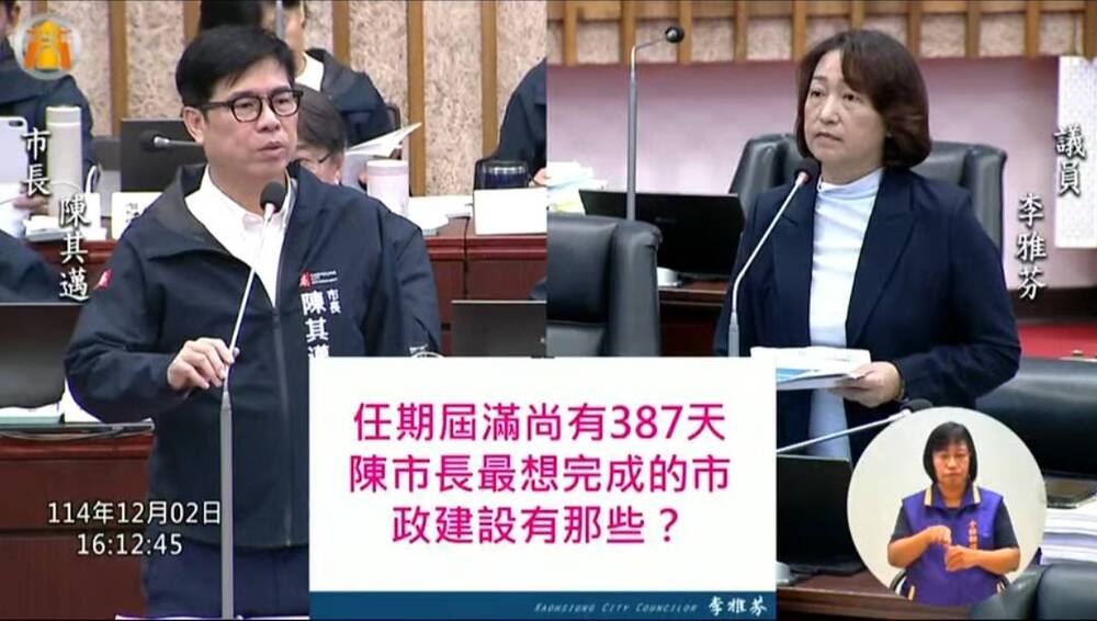 李雅芬議員指出,陳市長距離任期屆滿還有387天,還有哪些想完成的市政建設?陳其邁市長回應,左楠地區包含新台17線拓寬到南門圓環、捷運紫線行政程序、園區南路或後昌路整體交通改善,以及楠梓運動園區周遭交通及設施改善等。