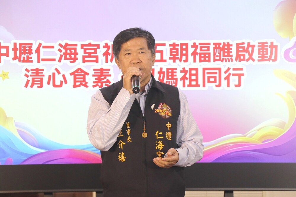 王介禧表示,在台灣與閩南、客家傳統信仰中,宮廟舉行醮典(建醮、祈安、禳災、清醮、圓醮等)期間,茹素是非常重要的傳統習俗。仁海宮祈安五朝福醮遵循傳統習俗,醮典期間全程茹素,以清心飲食敬天禮地、表達誠敬之意,同時也考量現代人的飲食習慣與健康概念,提出「清心食素,與媽祖同行,茹素五天」的倡議,將「茹素」轉化為一場身心靈的修持與環保行動。這不僅是齋戒,也是「體內環保、護生護地」的實踐。誠摯邀請信眾與市民朋友一同響應,以體諒環保、敬天護生的心念,從飲食開始實踐慈悲與清淨,讓信仰與環保同行,讓慈悲照亮中壢。希望能凝聚宮廟界與信徒共識,為皕載盛典揭開序幕。