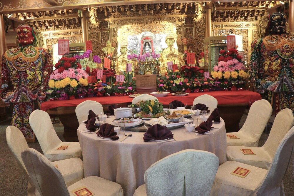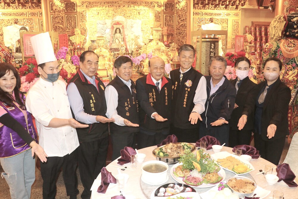 【記者鍾陽正桃園報導】中壢仁海宮建廟200週年祈安五朝福醮將於13日啟動至17日,為遵循傳統習俗,推廣醮典期間全程茹素的「清心食素」行動,特於4日上午在其舉行內殿舉行「清心食素?與媽祖同行」記者會,由董事長王介禧與副董事長鍾福晉、祈安五朝福醮醮務局主任委員范振修、執行長黃連應、北帝壇主委李閏進、天師壇主委張明發等人聯合敲鑼啟動,倡導五日清心食素行動,以慈悲心護生護地,展現信仰淨化之美德,邀請民眾一同響應,以體諒環保、敬天護生的心念,從飲食開始實踐慈悲與清淨。同時由香江餐廳精心設計素宴展示桌,象徵「平安、清淨、圓滿」三福,傳遞「以素敬天、以素養心」理念,畫面莊嚴神聖。