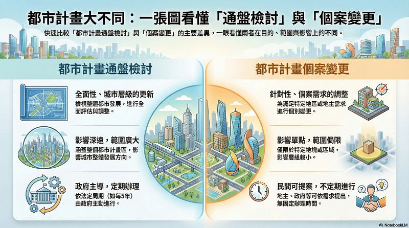 都發局表示,不過有些變化不必等到城市「全身檢查」才處理。例如某個區域常淹水、某處需要增設公共設施、或重大建設需要調整土地用途時,就會啟動「個案變更」。它像是特定部位的「專科診療」,針對特定土地做出微調。