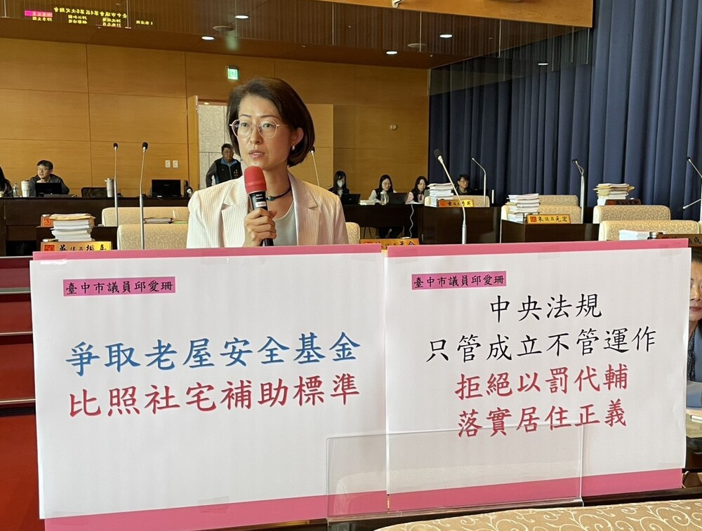【記者彭勝郎台中報導】關心老舊大樓住戶的居住安全,台中市議員邱愛珊8日於市議會總質詢指出,中央近期強制要求老舊公寓成立管委會,但實務上「只成立、不運作」的情況非常嚴重,讓公共安全形同虛設。她嚴正呼籲中央與地方務必正視弱勢大樓面臨的結構性困境,提出真正能落地的配套措施,避免悲劇重演。