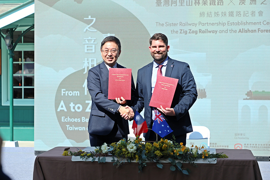 【記者張朝福嘉義報導】阿里山林業鐵路與澳洲新南威爾斯州的之字形鐵路(Zig Zag Railway),兩條同以「之」字形路線聞名的百年產業鐵路,9日在阿里山林鐵北門驛締結為姊妹鐵路,不僅見證了臺澳雙方以智慧克服地形限制、與山林共生的精神,更是將阿里山林業鐵路的國際合作網絡首度擴展至大洋洲,為全球遺產鐵路保存與永續樹立新里程碑。