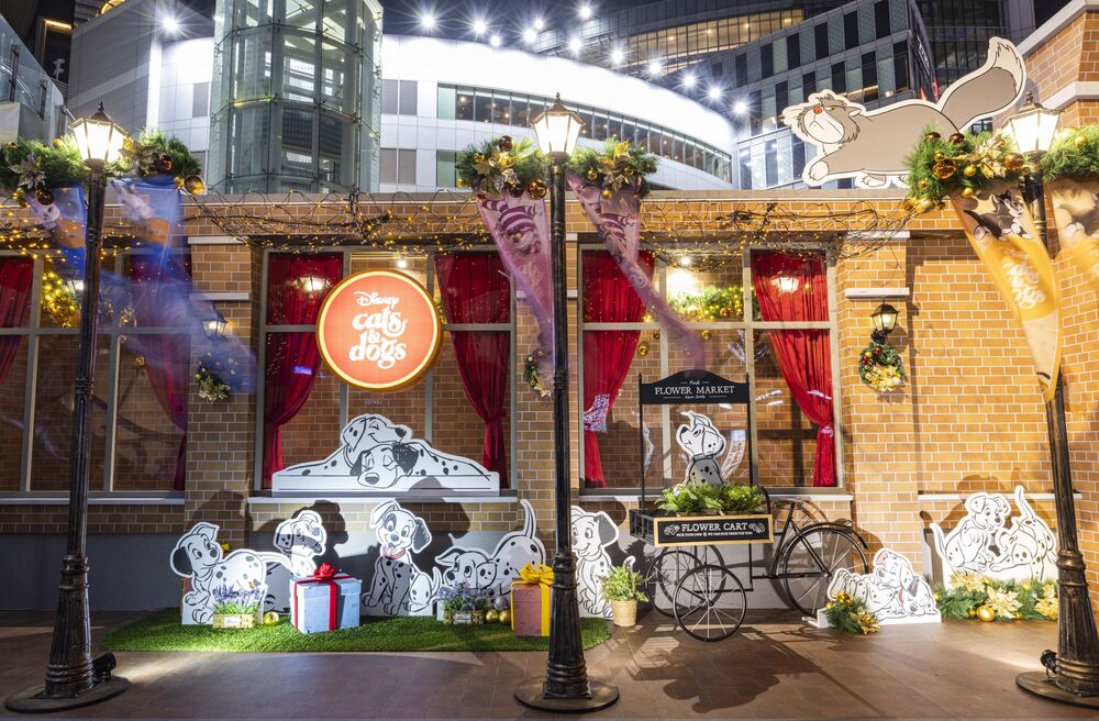 而耶誕樹主燈前方的星幕之始「星辰天幕廊道」,兩側分別由貓兒歷險記與布魯托的角色展開鋪陳,貓狗肉球的掌心,彼此共通的符號,在光映下的貓狗群像,是陪伴大家走進星光下的回憶時光。