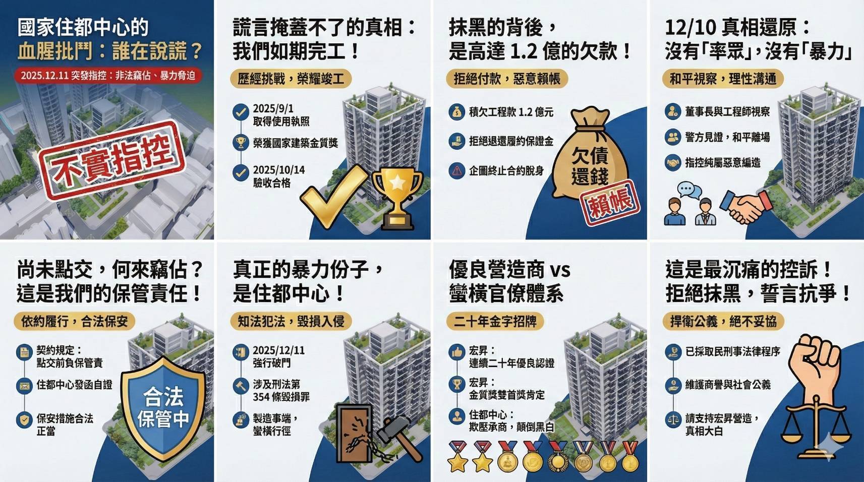 宏昇營造強調,依契約規定,在正式完成點交前,統包廠商本就負有建物保管責任,何來竊佔之說;12 月 10 日董事長郭倍宏前往工地,僅為點交前最後視察,並無「率眾」或任何暴力、脅迫行為。宏昇營造批評,住都中心未檢視自身履約問題,卻對外羅織罪名,已嚴重損害公司商譽與負責人名譽。