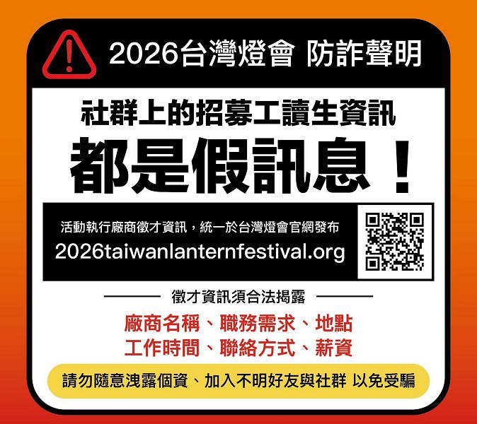 縣府指出,「2026台灣燈會」所有正式徵才資訊,僅會透過「2026台灣燈會官方網站」 https://2026taiwanlanternfestival.org/ 統一公告,不會透過私人社群帳號、不明連結或非官方表單進行徵才。