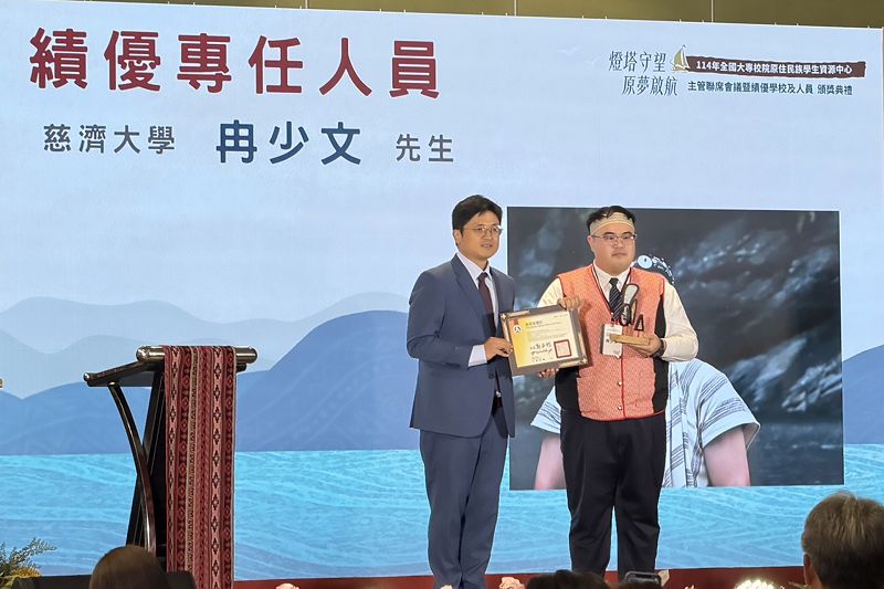 教育部舉辦114年全國大專校院原住民族學生資源中心主管聯席會議暨績優學校及人員頒獎典禮,慈濟大學原住民族學生資源中心多年深耕原住民族學生輔導與文化推廣的努力,榮獲114年績優學校,中心同仁冉少文並獲得「績優專任人員」,慈大原資中心從學業、生活、職涯、文化等全方位支持為原住民族學生,打造安心就學的環境,讓學生感受到「家的支持」。
