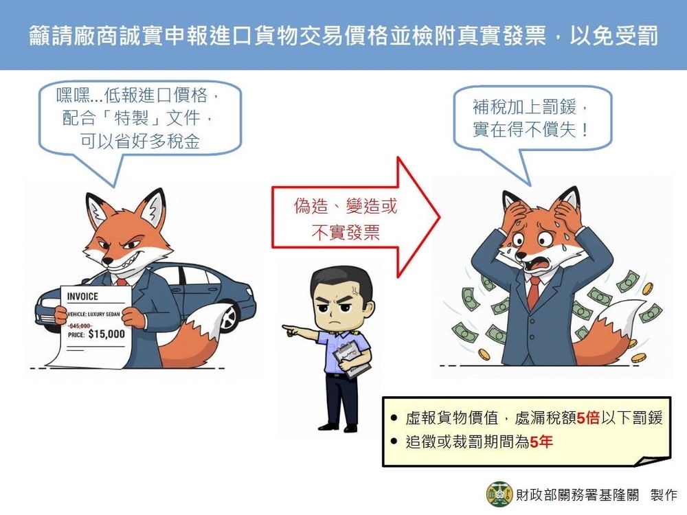 基隆關進一步說明,依《關稅法》第17條第1項規定,進口人於報關時,應填送貨物進口報單,並檢附發票、裝箱單及其他依法應備文件,如實申報進口貨物之交易價格及相關稅費。若經海關查獲所繳驗之發票或相關文件涉有不實情事,例如低報價格,除須補繳所漏稅費外,並將依法裁罰;如涉發票變造或偽造情形,進口人更須負擔相應刑事責任,後果不容小覷。