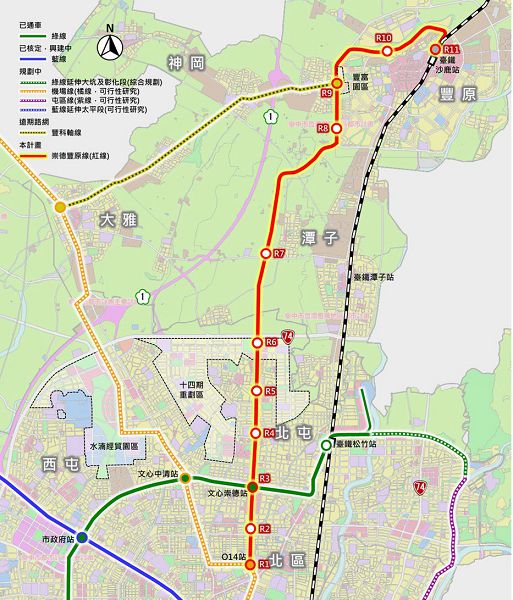 捷工局指出,崇德豐原線為台中捷運整體路網重要拼圖,路線串聯北區、北屯、潭子及豐原等人口集中區域,並與綠線、橘線、豐科軸線及台鐵系統銜接,強化轉乘便利性,提升公共運輸服務水準。目前可行性研究成果規劃路線全長約15.42公里,設置11座車站及1座五級機廠,目標打造「半小時軌道生活圈」,讓市民通勤與通學更加便捷。