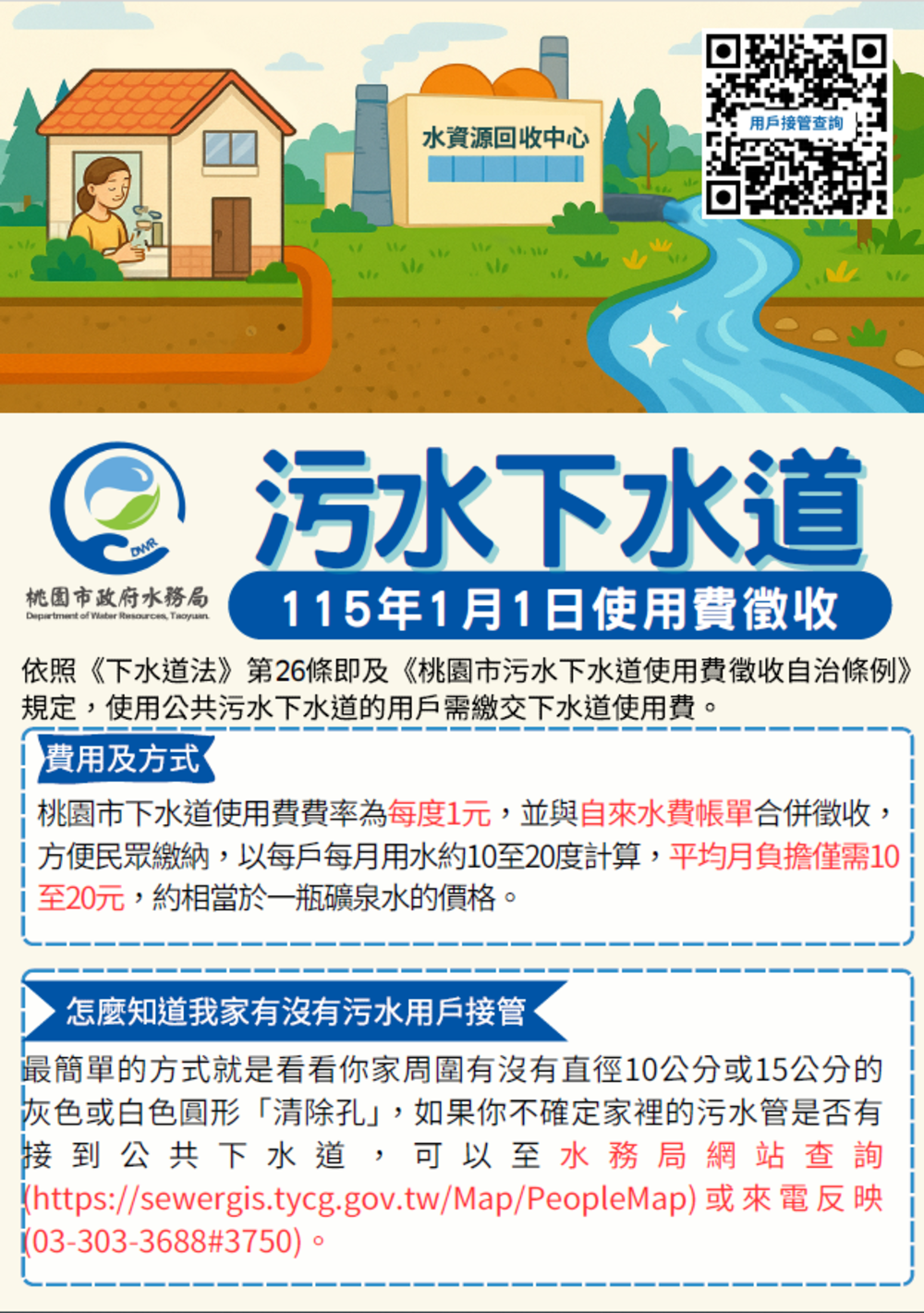 【記者吳惠民桃園報導】桃園市政府為打造更乾淨的城市環境與健康水資源,將自115年1月1日(2026年)起,正式開徵下水道使用費,費率為每度新臺幣1元,並與自來水費帳單合併收取,讓民眾繳費更便利。
