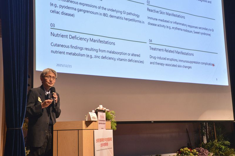 延續國際講者對皮膚作為疾病觀察窗口的討論,台北慈濟醫院兒科部余俊賢主任以「兒童腸胃與肝膽疾病的皮膚表現」為題,分享兒少病人在皮膚上所呈現的早期病理訊號。他指出,皮膚作為人體最大的器官,許多腸胃道疾病、肝膽病變與營養缺乏,往往會在皮膚上出現具指標性的變化。兒少病人在臨床上較難完整描述不適,若能正確判讀皮膚表現,將有助於醫師及早察覺潛藏的內在病理。余俊賢主任以「膽汁滯留所致搔癢」為例說明,該症狀雖表現在皮膚,但其成因可能與肝臟或膽道疾病相關,表示臨床醫師需留意皮膚變化背後所隱含的診斷線索,把握早期介入與治療的關鍵時機。