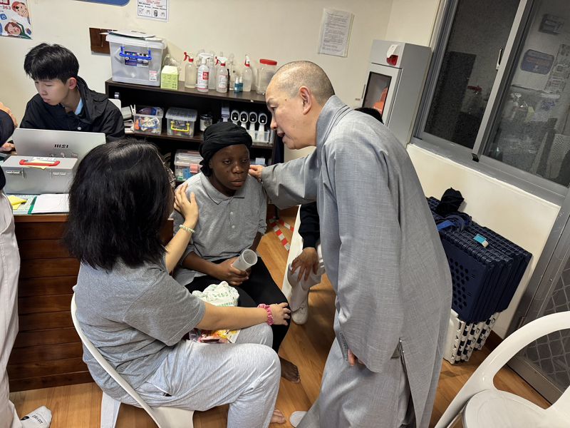 地震發生的當下,從海外來臺灣花蓮參加慈青營隊的學員安單寮房,出現不小的騷動與小小的尖叫聲。因為許多國家的年輕學員根本未經歷過遇到地震的經驗,所以一遇到四級有感地震來臨,會出現騷動不安的現象,實屬正常,幸好,負責慈青營隊的指導師父及照顧海外慈青生活的台灣籍的慈青營隊行政隊輔,立即一一安撫這群海外學員不安的心。