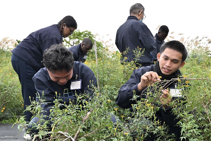 來自澳洲的學員則化身為農夫,在菜園裡拔除雜草。指導師父告訴他們,拔草的重點在於「除根」,要用心觀察植物特徵,不要把作物當作雜草。墨爾本慈青李健澔是第一次回來精舍,在澳洲有過園藝事務的經驗,他說:「如果遇到根部扎得很深的雜草,不能只拔除表面,必須往土裡深挖,務求根部徹底清理乾淨。」年輕的他有所體會,「拔草如同面對內心煩惱,唯有追根究柢、連根拔起,雜草才不會春風吹又生。」