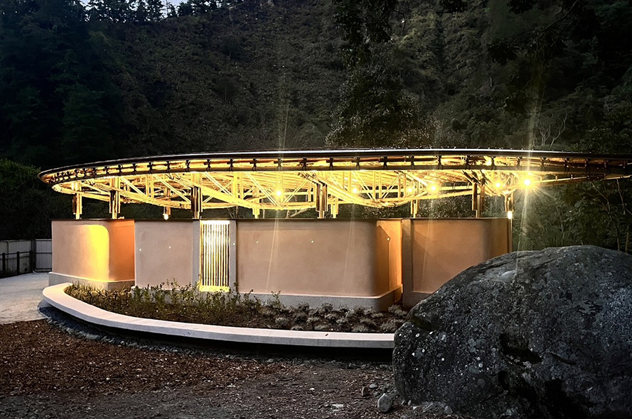 位於十文溪畔的「浮竹軒」公廁,以竹桁架屋頂勾勒如輕舟般的造型,輕盈融入溪石與山林,搭配夯土外牆展現土地的溫度,溪邊的竹藝休憩平台「竹泊」則以孟宗竹交叉編織的圓弧棚架,讓遊客靜坐聆聽溪流、沉浸森林療癒。