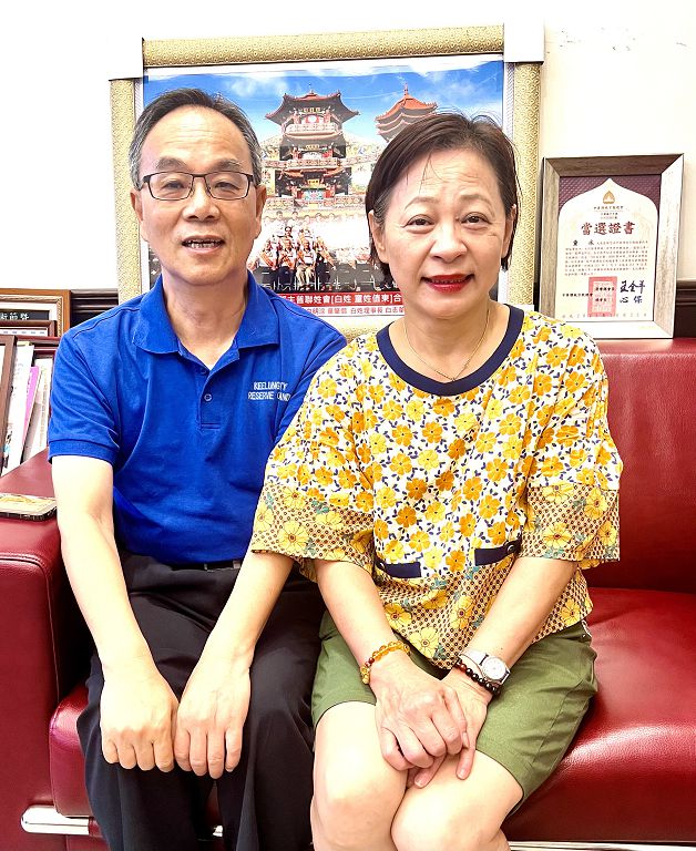 當選慶安宮主委的童德裕和擔任基市客家文化協會理事長的太太徐桂梅。(記者李伯元攝)