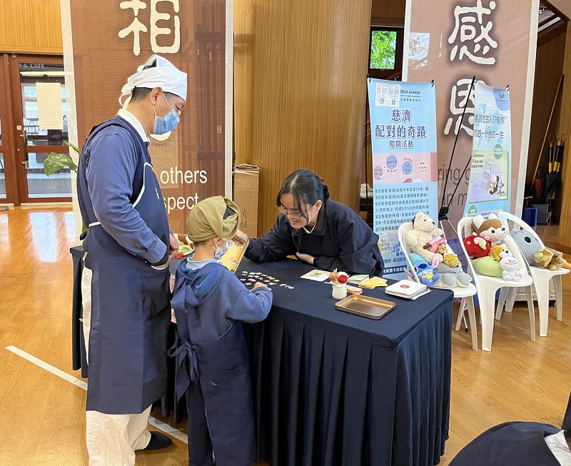 外語隊攤位前,孩童被桌上卡片吸引駐足。志工羅宥騏帶領孩子進行記憶拼圖,一邊翻牌、一邊學英文,反應靈活,令家長讚歎。英語能力較佳的孩子則加碼玩「比手畫腳猜圖」,笑聲不斷。