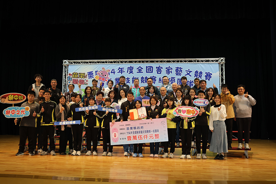 今年全國中小學客家藝文競賽於12月初在正修科技大學舉辦,苗栗縣共25支隊伍與全國86支隊伍較勁,在歌唱表演、口說藝術及戲劇三大類共15項組別中,獅潭國小附幼、公館國小附幼、建功國小、建國國小、文山國小、建國國中及獅潭國中等7校榮獲第一名。