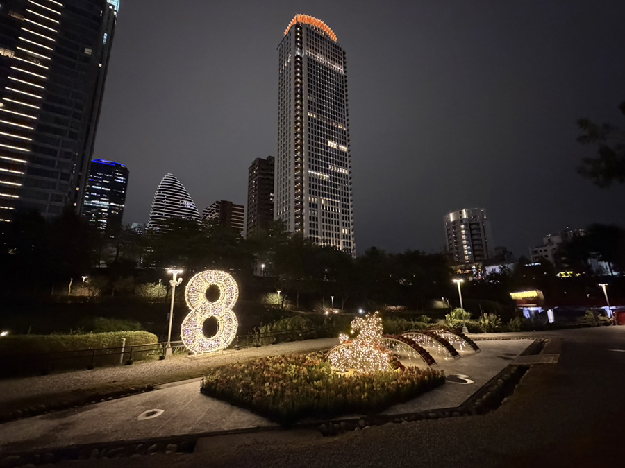其中,秋紅谷公園以360度環湖視角呈現「8」字燈光意象,璀璨燈光與心之谷展館、觀景橋相互映襯,水面倒影交織出層次豐富的都會夜色;豐樂雕塑公園則於開闊廣場設置兩層樓高的「8」字大型燈飾,氣勢磅礡、視覺效果震撼,成為園區夜間焦點。