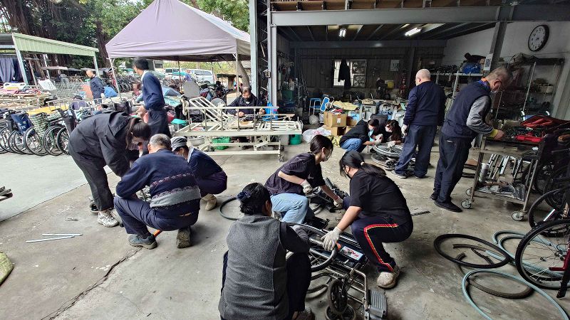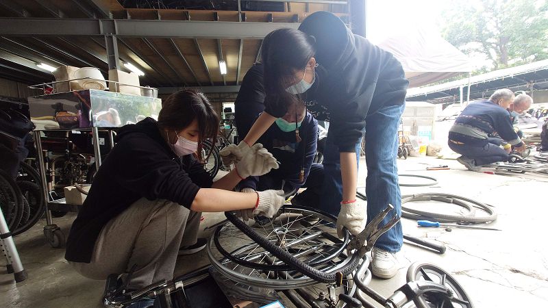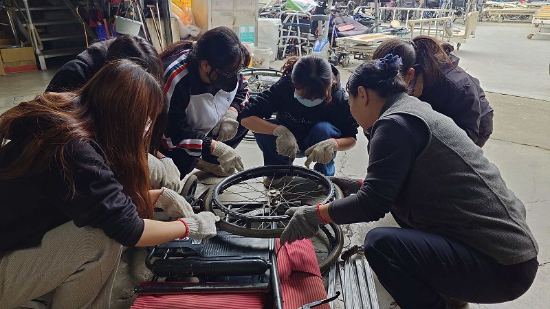 鍾寀葶同學專注投入,忍不住直呼「腰真的好酸!」一度想放棄,但在志工鼓勵與指導下,仍完成3張輪椅的維修。志工也分享:「3張輪椅,不只是幫助3個家庭,在善的循環與再利用下,能幫助更多需要的人。」細心的寀葶也觀察到,對行動不便者而言,只要雙手還能活動,就能自行推動輪椅,增加行動自主性與生活尊嚴。