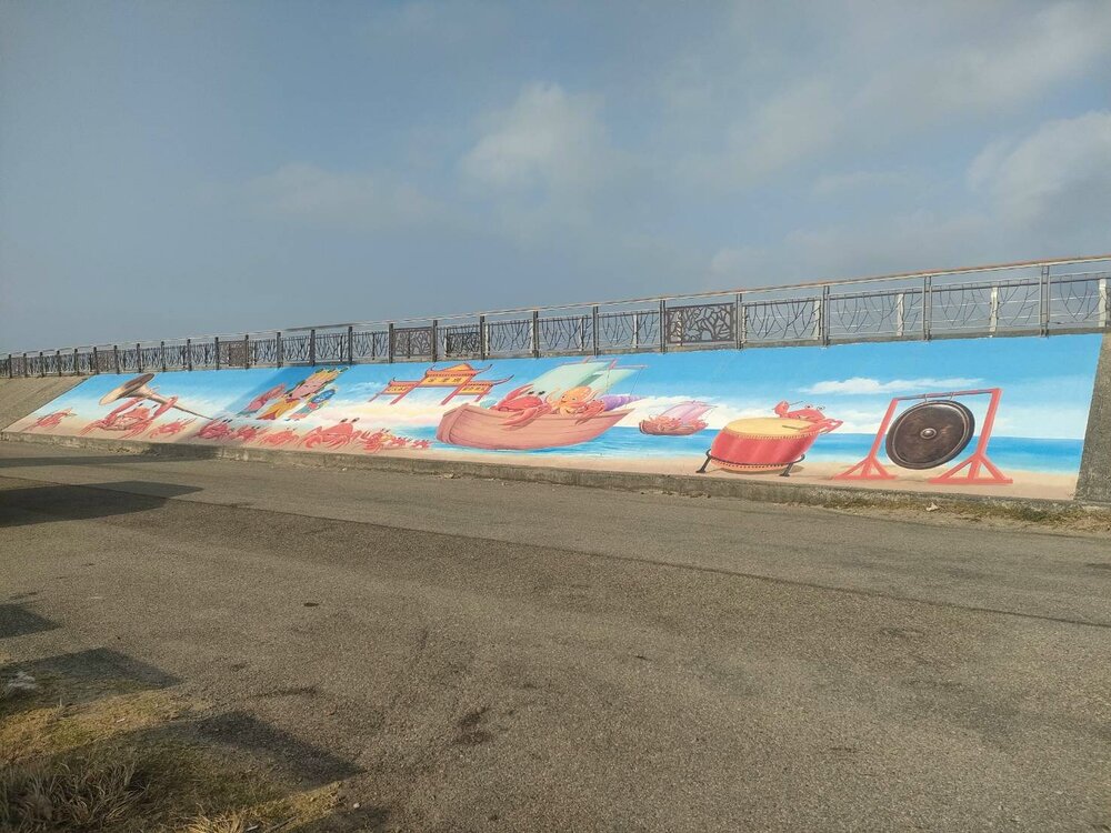 【記者陳榮昌大甲報導】臺中市大甲區匠師的故鄉休閒農業區利用區內海堤閒置之牆面邀請在地藝術家進行彩繪,此次彩繪主題配合農業部農村發展及水土保持署臺中分署與臺中市政府農業局之「山盟海寺」農遊政策,以大甲媽祖文化結合匠師的故鄉休區明星物種螃蟹,繪製Q版3D立體彩繪,美化原本平凡無奇的海岸堤防並增添童趣,打造具有在地濱海意象之嶄新打卡點。