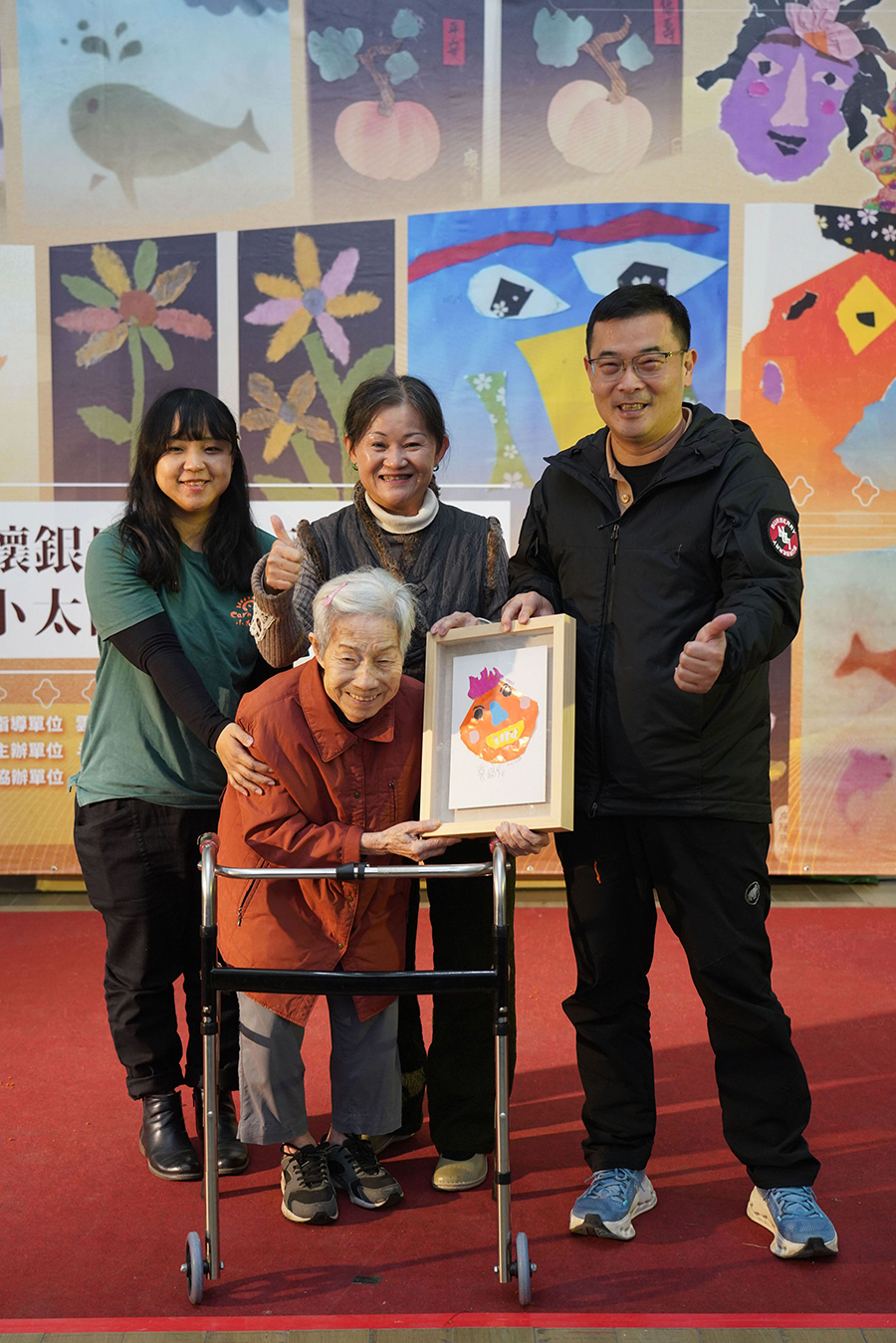 圖說3︰市長林聖爵與高齡92歲長者及其畫作、小太陽日間照護中心負責人合影。(記者蔡鳳敏攝)