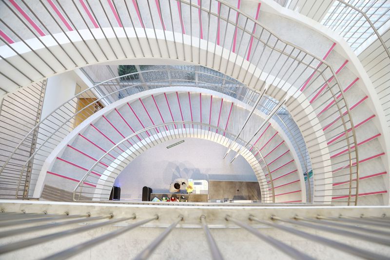 此外,外牆特別採用雙層隔熱設計,有效阻隔熱能,減少空調負荷達到節能效果,並利用誘導式通風原理,於冬季及春天採用間歇性空調概念,於建築中設置通風塔並結合弧形樓梯,透過煙囪效應引入自然新鮮空氣,促進館內對流通風,減少對空調的依賴,藉以達到圖書館節能永續目標,還能兼顧優質室內空氣品質的閱覽環境,形成一座「會呼吸的圖書館」。