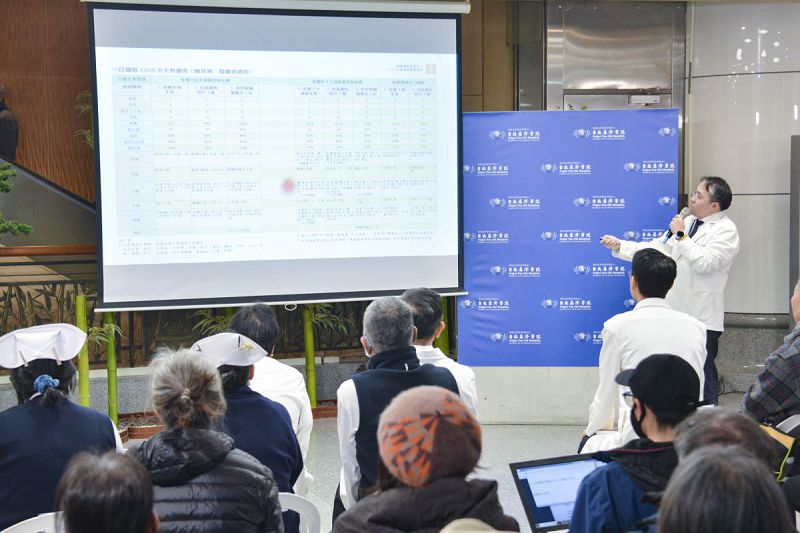 腎臟內科王奕淳醫師(上)與營養科江政陽副主任(下) 在活動中分享糖尿病腎臟病飲食重點與美味菜單。