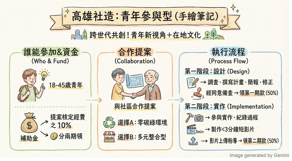 【記者吳峙嵩高雄報導】都市發展局啟動「115年度高雄市社區營造實施計畫」,即日起受理申請。除延續以往新增社造點及維護管理補助機制外,特新增「青年參與型」社造方案,鼓勵18至45歲青年,實際投入社區營造行動,促進跨世代合作,為社區發展注入創新能量。