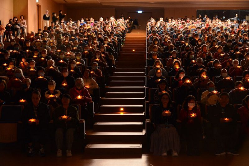 主持人周淑芬與李穎瑞師姊透過彩球互動與拋接遊戲炒熱氣氛,六十歲的會眾紛紛獻上「健康平安」、「人心淨化」、「幸福安康」等祝福,場面溫馨熱鬧。司儀張薾桐指出,新年是快樂許願的時刻,透過感恩會將一年的付出化為慈悲智慧之花;新店文山團隊演繹〈心蓮〉手語,歌聲象徵心蓮遍開人間淨土,祈願新年福慧雙修,社區里長踴躍參與並感謝「富有愛心店」延續竹筒歲月精神。