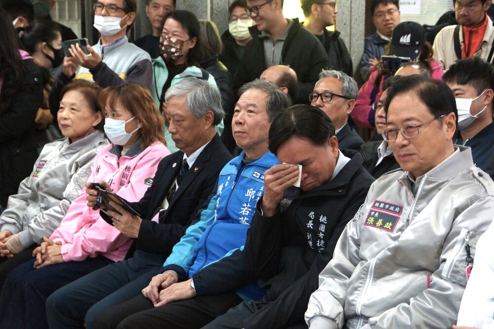 說道桃園捷運綠線工程艱辛,挑戰不可能的任務,捷運工程局局長劉慶豐(前右二)掩面拭淚,桃園市長張善政(前右一)眼眶泛紅。(記者徐玉英攝)