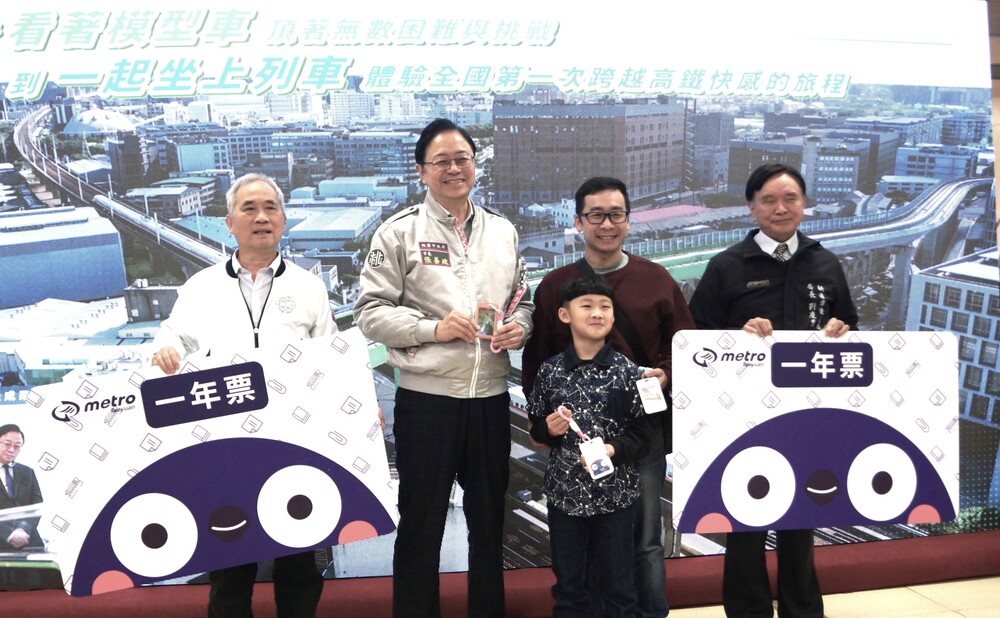 在桃園捷運綠線試車開放試乘時,有位小朋友許下願望,希望小朋友能免費搭捷運,桃園市長張善政與捷運工程局贈以一年免費票讓他如願以償。(記者徐玉英攝)