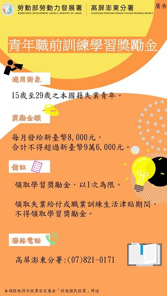 高屏澎東分署長郭耿華表示,青年是引領台灣產業轉型與升級的核心動能,面對全球經貿情勢的劇烈變動與挑戰,透過精準的職前訓練與完善的學習獎勵金制度,高分署將是青年朋友最堅實的後盾;115年全新規劃職訓課程已開始受理報名,包含「半導體工程師」、「全端工程師」、「網路資安工程師」、「ESG淨零永續人才」及「風電產業國際人才」等超過30門搶手課程將陸續開課,歡迎15至29歲正在尋職的青年可先至「台灣就業通」註冊,並完成「我喜歡做的事」職涯興趣探索測驗後,進入「產業新尖兵計畫」專區搜尋相關課程,欲了解更多詳細資訊,歡迎電洽高分署服務專線(07)8210171,將由專人提供詳細解說。