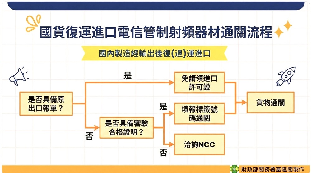 基隆關表示,依據《電信管制射頻器材管理辦法》第18條第1項第3款規定,國內製造之電信管制射頻器材,經輸出後再行復(退)運進口者,得免向國家通訊傳播委員會(NCC)申請進口許可證;惟進口人於報關時,仍須主動檢附該貨物之「原出口報單」供海關審核,始得適用免證通關。