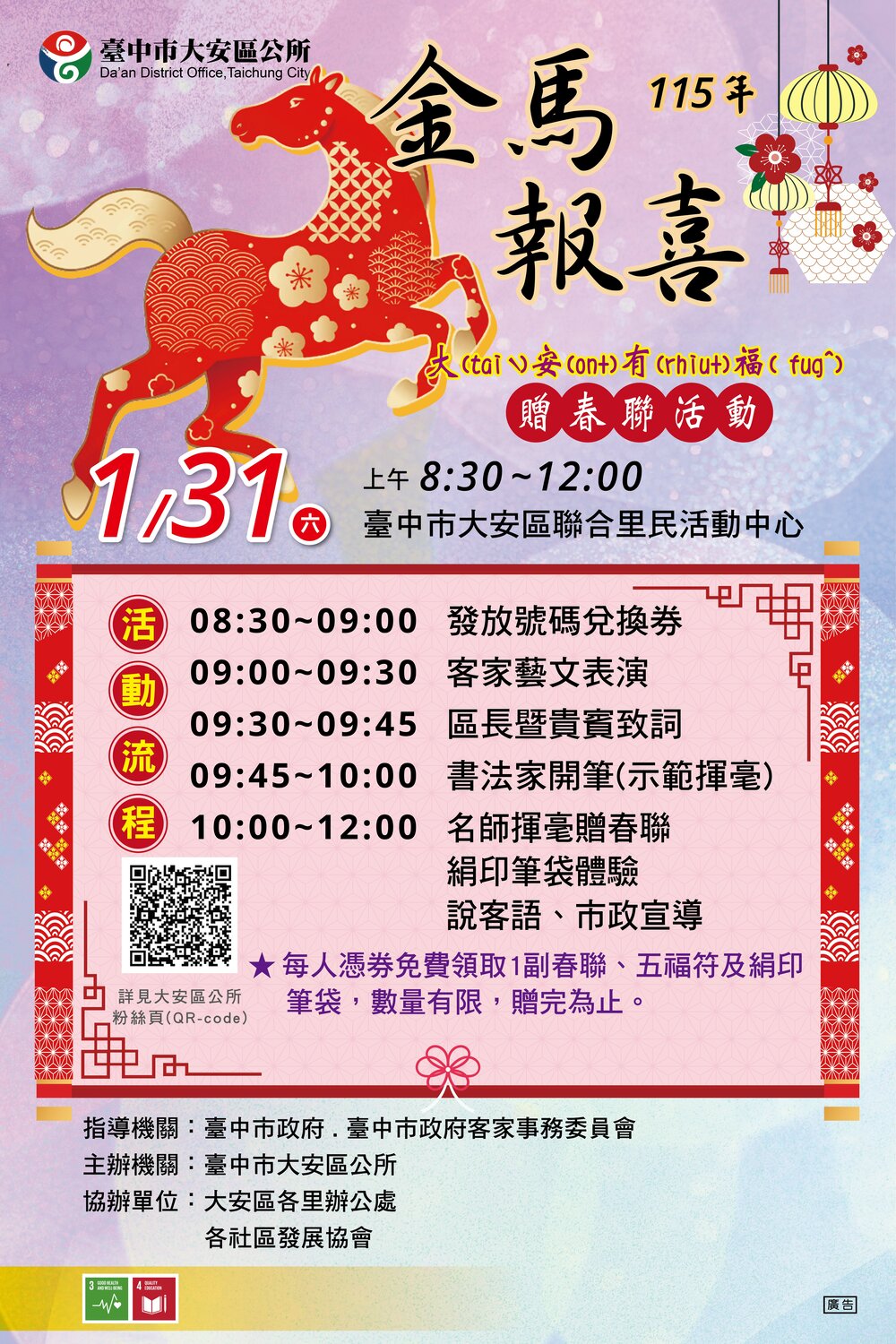 【記者陳榮昌大安報導】臺中市政府客家事務委員會為推廣及傳承客家文化,與大安區公所合作,訂於三十一日上午在大安區聯合里民活動中心舉辦「115年金馬報喜大安有福贈春聯活動」,與民眾一起迎接嶄新的「金馬」豐收年!