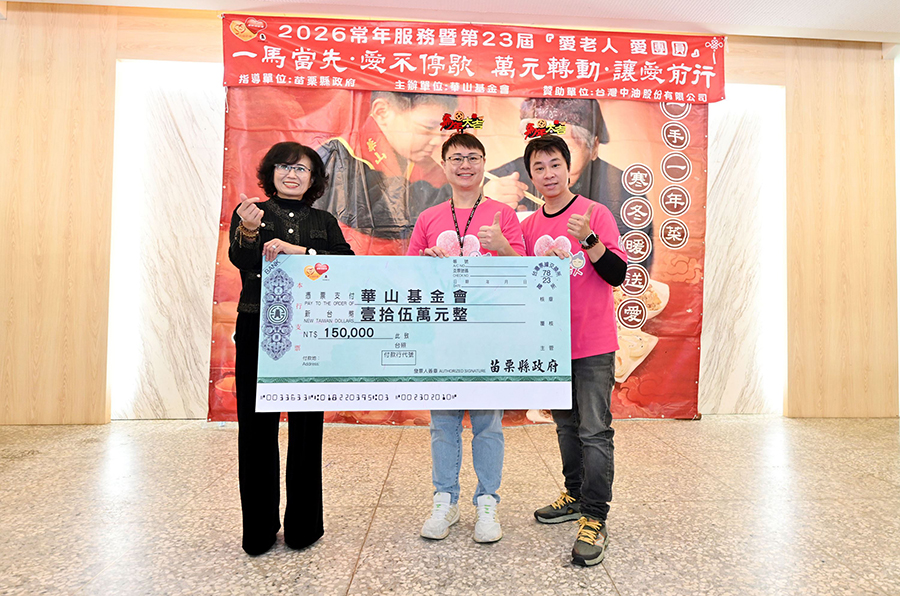 【記者林盈焜羅玉女苗栗報導】苗栗縣政府與華山基金會15日共同啟動「愛老人、愛團圓」致贈獨居老人年菜活動,副縣長邱俐俐上午代表縣府捐助15萬元年菜金,並與華山基金會苗栗愛心天使站站長余智達號召社會各界攜手關懷,讓獨居長輩在春節期間也能感受團圓溫暖。