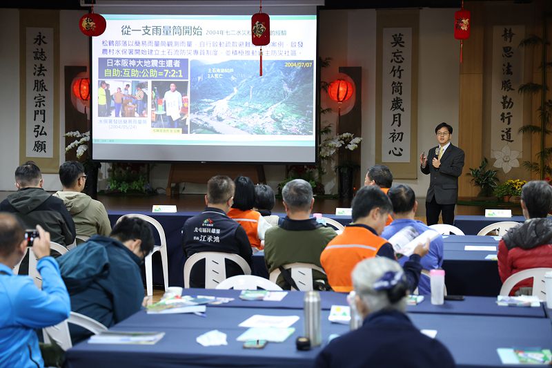 農村水保署主任秘書陳重光於致詞時指出,面對極端氣候挑戰,單靠政府資源已不足以因應。慈濟在921地震時的高效行動力,以及在花蓮馬太鞍溪堰塞湖事件中的默默付出,展現了極強的人文關懷,陳重光:「台積電是經濟的護國神山,慈濟則是心靈的護國神山。」他強調,未來防災將結合AI與智慧科技,推動系統化管理,「房子倒了可以重建,但生命無法重來。」