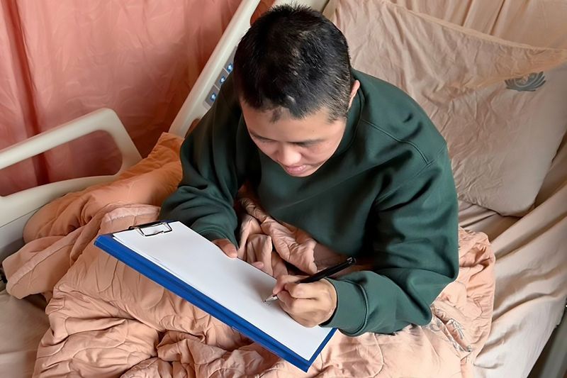 在這關鍵的36天裡,盧副站長先是在加護病房度過了最危險的兩週,隨後轉入一般病房進行兩週多的觀察與照護。從最初的重度昏迷,到如今意識完全清醒,能與家人、醫護人員輕鬆對話。個性隨和開朗的盧副站長,在住院期間展現了極佳的適應力。儘管右手因骨折影響暫時無法活動,且需持續接受漫長的復健,但她在轉入一般病房後,迅速將自己練成了「左撇子」。現在的她,不但能熟練地用左手自理生活起居,就連寫字也難不倒她。對於醫院提供的蔬食餐點,盧副站長說自己吃得非常習慣。當被問及出院後最想做的一件事時,她笑著說:「雖然醫院照顧得很好,但現在唯一最想念的,還是家裡那張熟悉的床。」