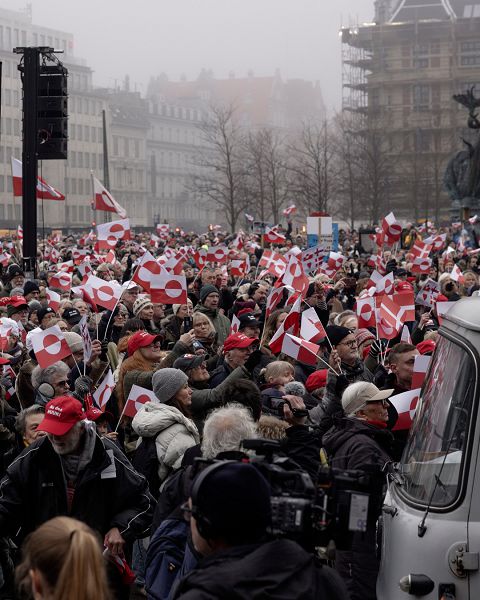 哥本哈根的遊行在市政廳廣場集結,儘管天氣寒冷、大霧瀰漫,還是來了幾千名支持格陵蘭主權的民眾,擠滿了整個廣場。參與遊行的民眾有男有女、各個年齡層都有,其中有丹麥人也有格陵蘭人,還包括一些外國人。
