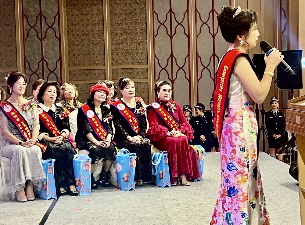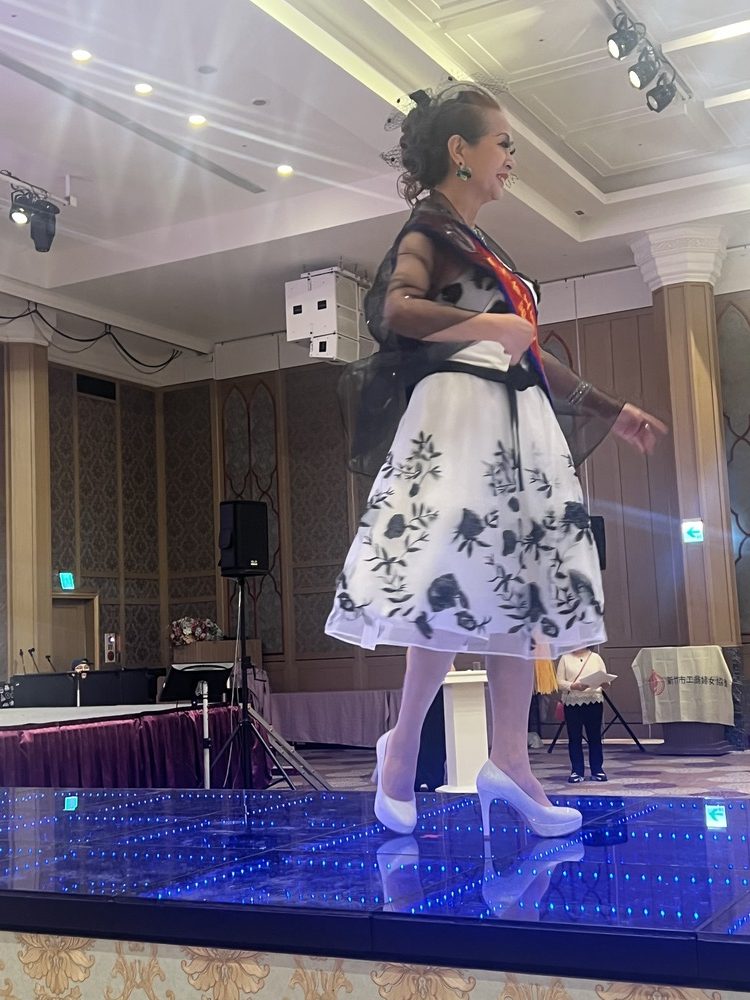 圖:右起2屆劉劍瑛,3屆林金鳳4屆林秀鳳6屆廖珮姗16屆駱麗美理事長(圖一);17屆理事長莊秋香致詞(圖二);第七屆理事長凃俐安走秀上台(圖三)。(記者李伯元攝)