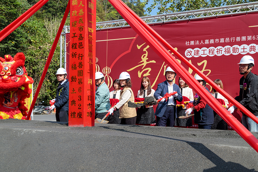 今包括翁縣長、立委蔡易餘、中埔鄉長李碧雲、嘉邑行善團理事長鄭秀玉、台南市副市長姜淋煌、建設處長郭良江等人持鏟動土,焚香獻花祝禱工程如期如質完工。