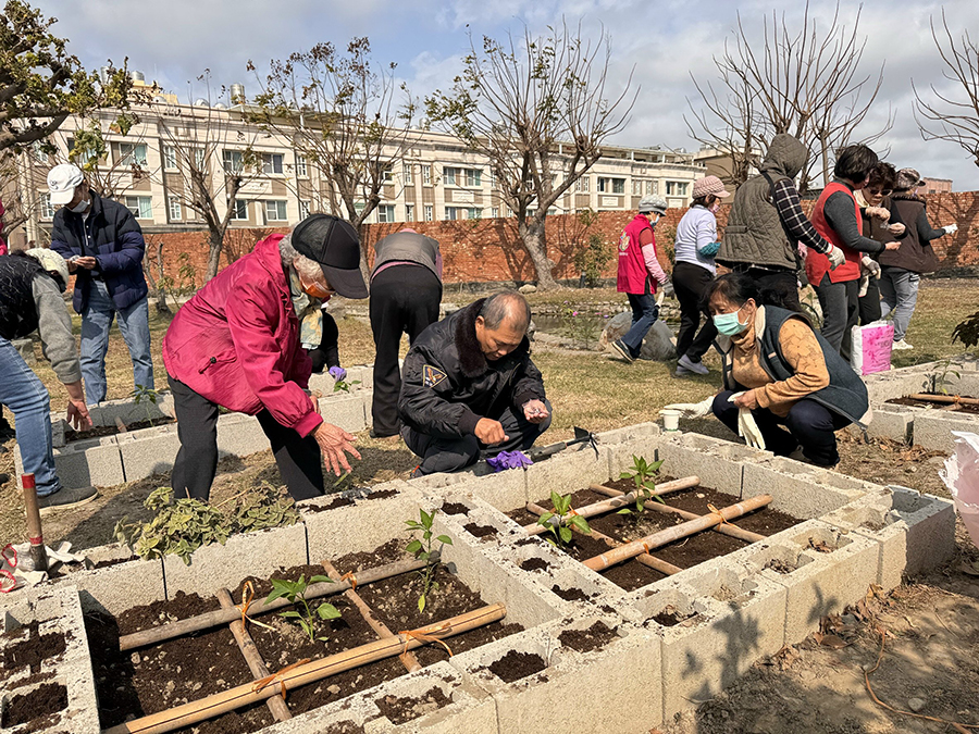 學員們圍繞在空心磚堆砌而成的一米菜園旁,細心地將種子與幼苗安置於土壤中。有人蹲下身專注播種,有人協助整理土壤與澆灌位置,現場氣氛熱絡而溫馨。透過實際動手操作,不僅讓學員加深對作物生長的理解,也在彎腰、蹲立與協作過程中,達到身體活動與人際互動的雙重效果。