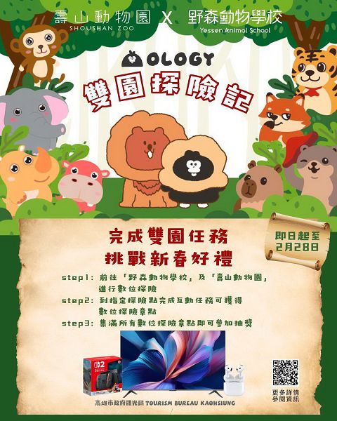 此外,百萬人氣插圖角色「掰掰啾啾奧樂雞」首次跨足動物界,由奧樂雞擔任探險隊長,帶領民眾走進壽山動物園與野森動物學校,展開2月限定「雙園探險記」,活動結合數位互動任務與豐富摸彩獎項,禮品包含55吋QLED 電視、Switch、AirPods 等總價值10萬元大獎。