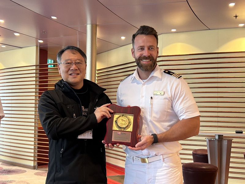 臺灣港務股份有限公司基隆港務分公司高級研究員張維鍵(左)代表致贈首航紀念牌予愛達女神號船長Michael Schmid(右)。(臺灣港務公司基隆分公司提供)