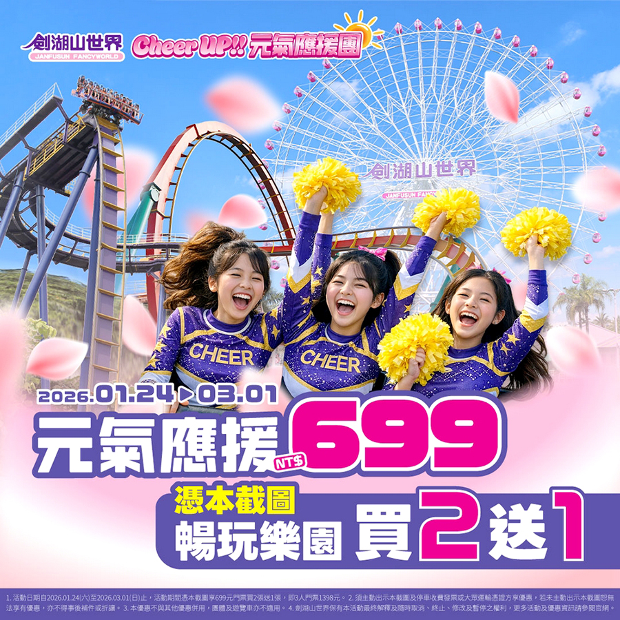 劍湖山世界總經理曾慶欑表示,1月24日至3月1日推出限時門票優惠,民眾憑指定方式購票即可享「買二送一」,再加碼贈送「佐登妮絲城堡」門票,讓行程從刺激樂園延伸至歐風城堡。寒假期間更邀請瑄瑄、柳柳、檸檬等明星啦啦隊女孩輪番到場應援,春節過後將由林襄、安芝儇等共15位中外人氣啦啦隊女孩接力登場,為園區注入滿滿活力。