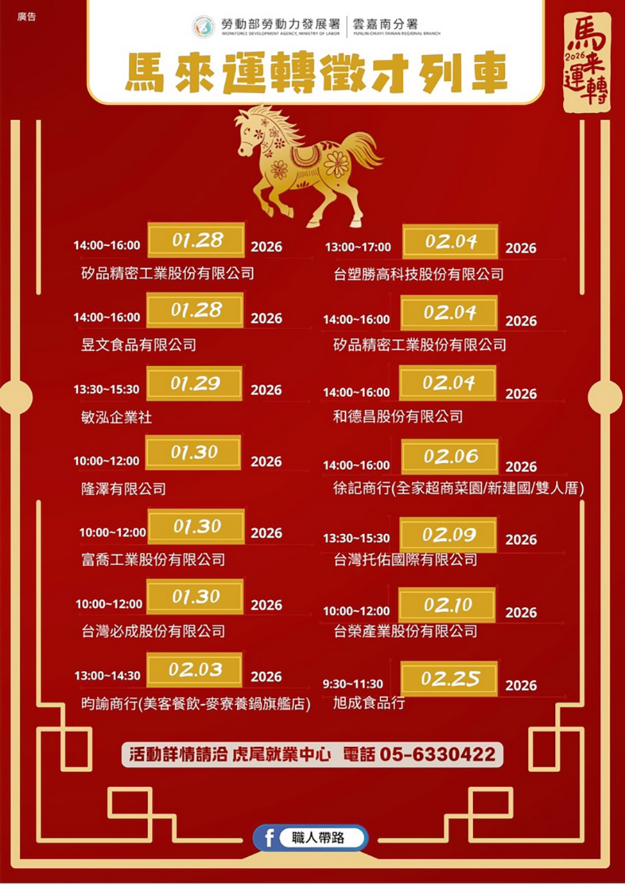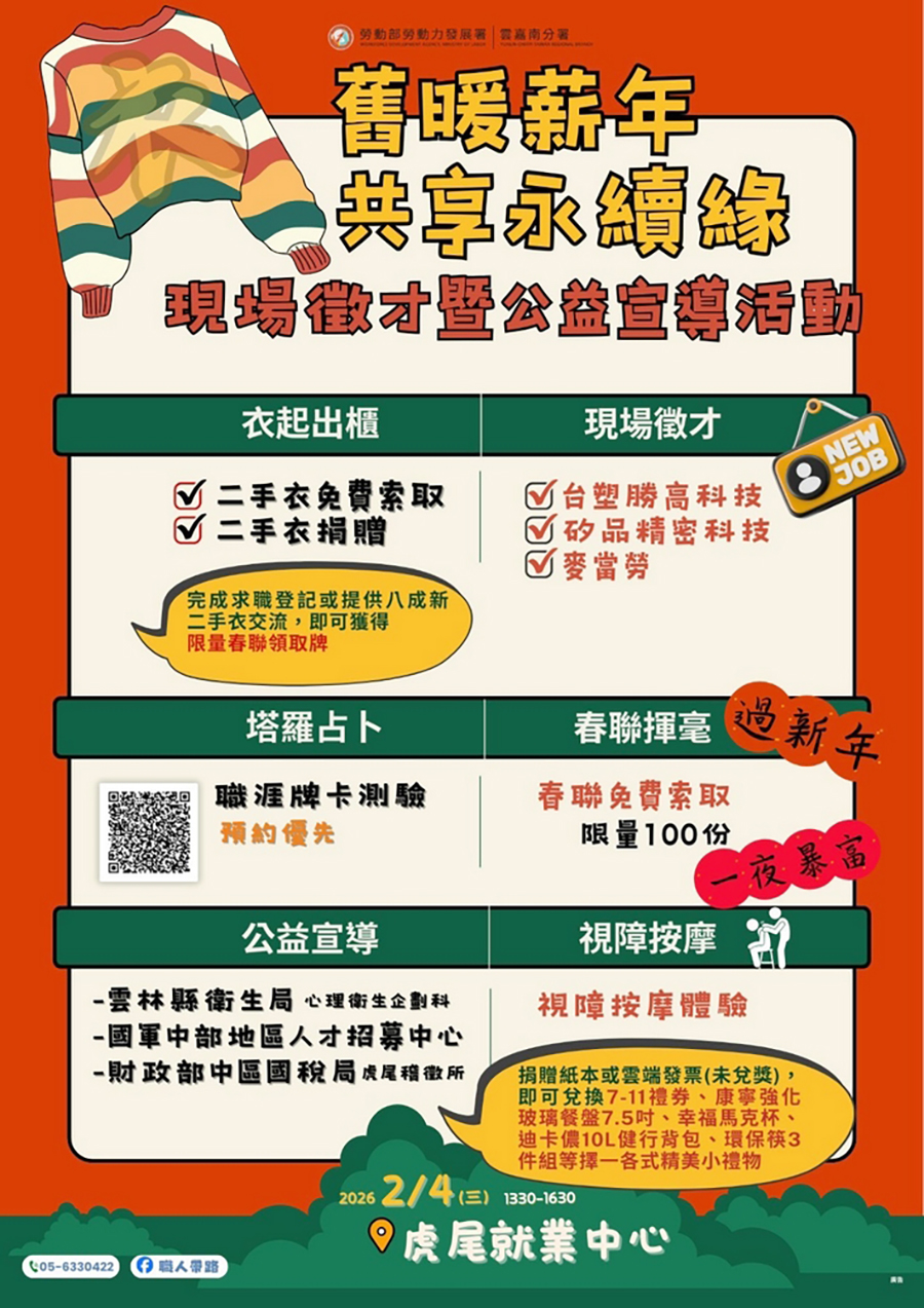 【記者雷琇雯雲林報導】為協助民眾在農曆春節前掌握就業契機,勞動部勞動力發展署雲嘉南分署虎尾就業中心將於2月4日下午舉辦「衣舊暖薪年、共享永續緣」現場徵才暨公益宣導活動。活動以「找工作、做公益、學永續」為主軸,結合企業徵才、政府資源宣導及多元體驗服務,打造兼具實用性與趣味性的就業服務平台。