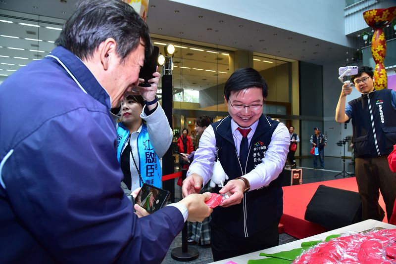 市府客委會主委江俊龍與現場民眾分享新丁粄、分享好運。