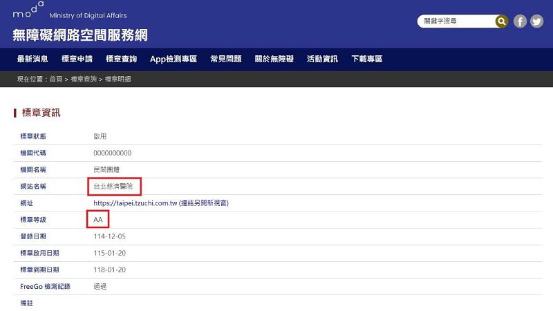 台北慈濟醫院官方網頁全站通過數位發展部無障礙網頁規範AA等級認證。