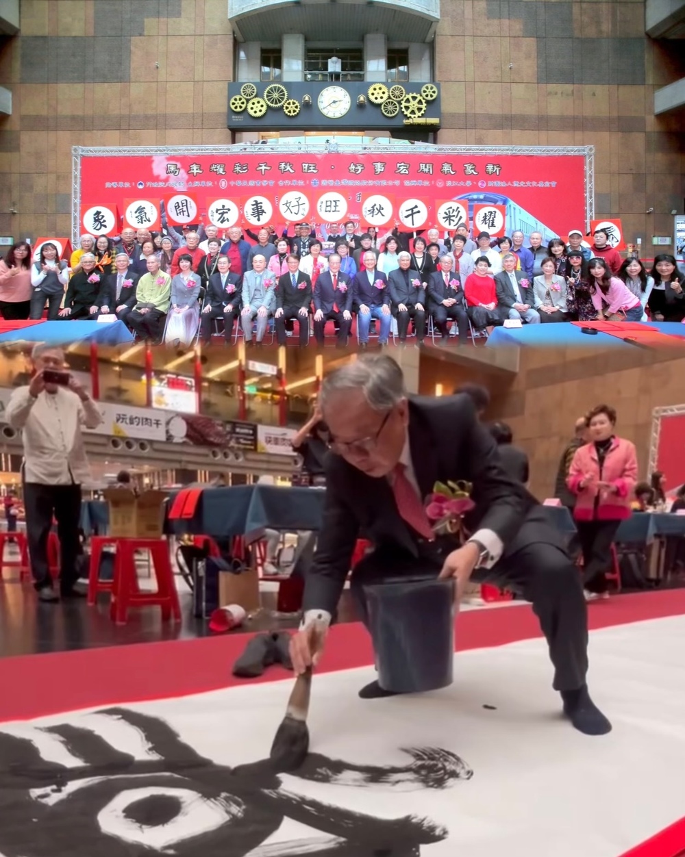 今年特選在交通樞紐台北車站舉行,邀請14位重量級嘉賓共同開筆,包括內政部主任秘書黃駿逸、臺鐵董事長鄭光遠、前立法院長游錫堃、億光文教基金會董事長簡文秀、日本台灣交流協會台北事務所代表片山和之、淡江大學世界校友會聯合會總會長陳進財、臺灣鐵路總經理馮輝昇、嘉義縣朴子市市長吳品叡、中華民國畫學會理事長沈禎、中華文化藝術總院書法院院長楊旭堂、臺灣國際蘭亭筆會會長陳美秀、中華民國書學會副會長嚴建忠、中華民國書學會理事長王為權及淡江大學張炳煌教授14位嘉賓,每人書寫70公分見方大字,象徵「丙午馬年」興旺啟程、萬象更新。