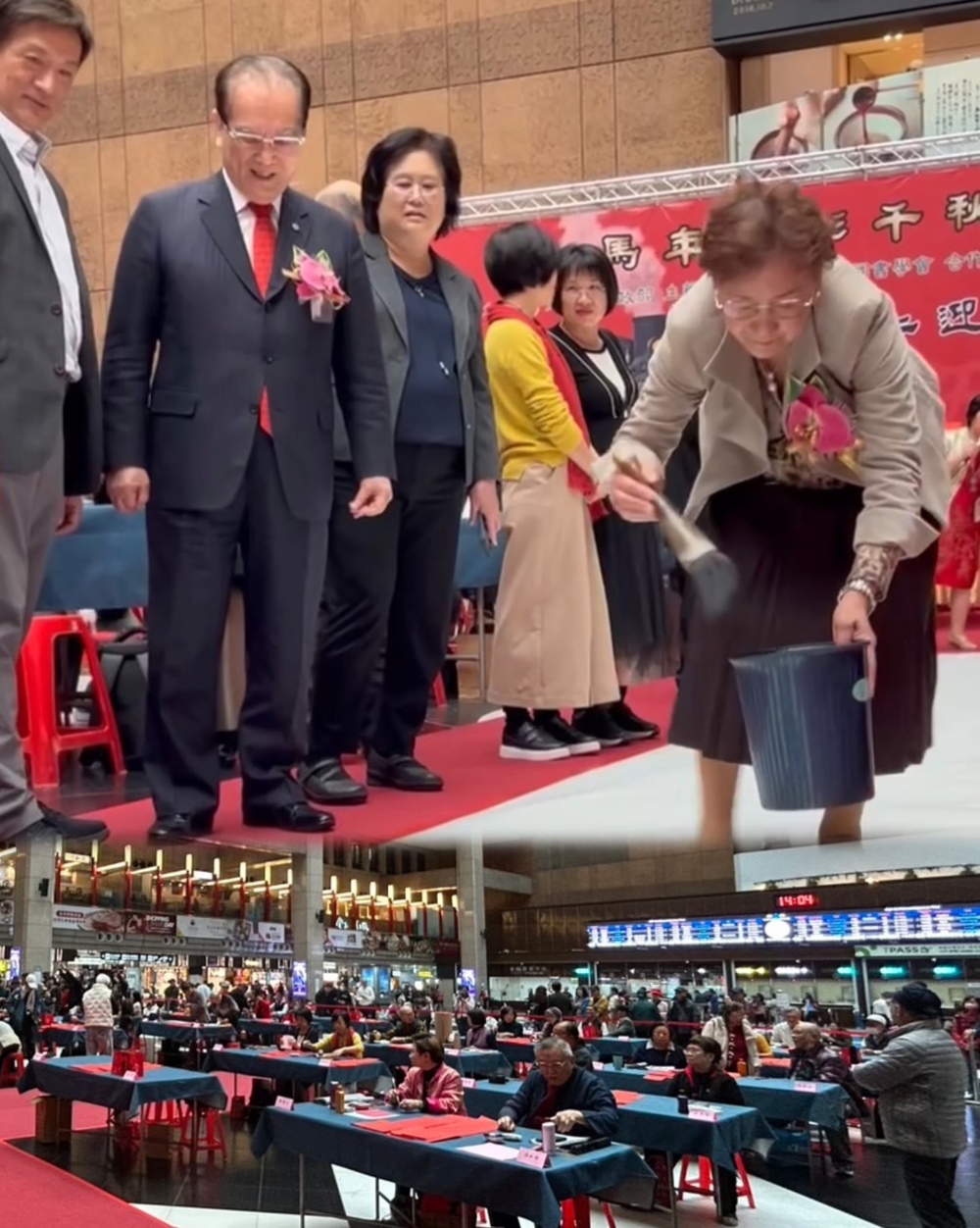 臺鐵董事長鄭光遠(上左二)希望臺鐵成為連結城鄉與人情文化重要平台。專注欣賞蘭亭筆會陳美秀會長 (上右) 地書大字 / 北車化身最大春聯書法舞台(下) 。(書學會李彩鳳提供)